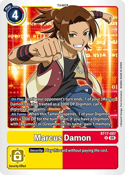 Marcus Damon BT17-087 R [On Play] Until the end of your opponent's turn, 1 of your [Marcus Damon]s is also treated as a 3000 DP Digimon, can't digivolve and gains <Blocker>. [All Turns] When this Tamer becomes suspended, 1 of your Digimon gets +3000 DP for the turn. If you have a Digimon with [Agumon] or [Greymon] in its name, gain 1 memory. --- [Security] Play this card without paying the cost.
