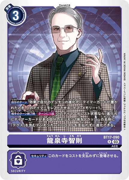 龍泉寺智則 BT17-090 R AE社 【自分のターン】効果で自分のデジモンの進化元にテイマーカードが置かれたとき、このテイマーをレストさせることで、メモリー+1。 【相手のターン終了時】[ターンに1回]このテイマーがレスト状態なら、進化元にテイマーカードがある自分のデジモン1体をトラッシュの名称に「デクス」を含むデジモンカードにコストを支払わずに進化できる。 --- 【セキュリティ】このカードをコストを支払わずに登場させる。