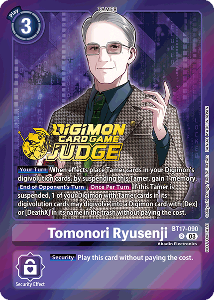 Tomonori Ryusenji BT17-090 R Abadin Electronics [Your Turn] When an effect places a Tamer card in one of your Digimon's digivolution cards, by suspending this Tamer, gain 1 memory. [End of Opponent's Turn] [Once Per Turn] If this Tamer is suspended, 1 of your Digimon with a Tamer card in its digivolution cards may digivolve into a Digimon card with [Dex] or [DeathX] in its name in the trash without paying the cost. --- [Security] Play this card without paying the cost.