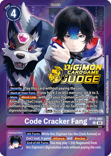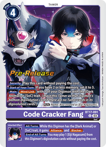 Code Cracker Fang BT17-091 U SoC [Security] Play this card without paying the cost. [Start of Your Turn] If you have 2 or less memory, set it to 3. [Main] <Mind Link> with 1 of your Digimon with the [Dark Animal] or [SoC] trait. (Place this Tamer as that Digimon's bottom digivolution card if there are no Tamer cards in its digivolution cards.) (Rule) Name: Also treated as [Eiji Nagasumi]. --- [All Turns] While this Digimon has the [Dark Animal] or [SoC] trait, it gains <Alliance> and <Blocker>. [End of All Turns] You may play 1 [Eiji Nagasumi] from this Digimon's digivolution cards without paying the cost.