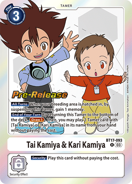 Tai Kamiya & Kari Kamiya BT17-093 R [All Turns] When you hatch in the breeding area, by suspending this Tamer, gain 1 memory. [End of Your Turn] By returning this Tamer to the bottom of the deck, <Draw 1> Then, you may play 1 Tamer card with [Tai Kamiya] or [Kari Kamiya] in its name from your hand without paying the cost. --- [Security] Play this card without paying the cost.