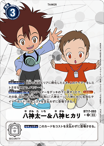 八神太一&八神ヒカリ BT17-093 R 【お互いのターン】自分の育成エリアに孵化したとき、このテイマーをレストさせることで、メモリー+1。 【自分のターン終了時】このテイマーをデッキの下に戻すことで、≪1ドロー≫。その後、自分の手札から、名称に「八神太一」/「八神ヒカリ」を含むテイマーカード1枚をコストを支払わずに登場できる。 --- 【セキュリティ】このカードをコストを支払わずに登場させる。