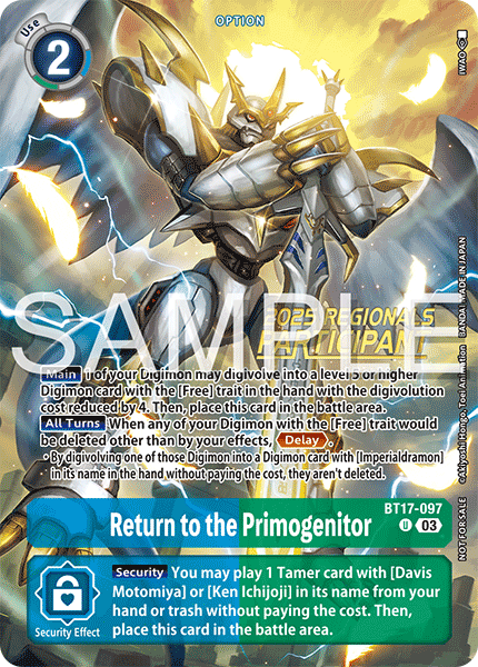 Return to the Primogenitor BT17-097 U [Main] 1 of your Digimon may digivolve into a level 5 or higher Digimon card with the [Free] trait in your hand with the digivolution cost reduced by 4. Then, place this card in the battle area. [All Turns] When one of your Digimon with the [Free] trait would be deleted other than by one of your effects, <Delay> • By digivolving that Digimon into a Digimon card with [Imperialdramon] in its name in your hand without paying the cost, prevent that deletion. --- [Security] You may play 1 Tamer card with [Davis Motomiya] or [Ken Ichijoji] in its name from your hand or trash without paying the cost. Then, place this card in the battle area.