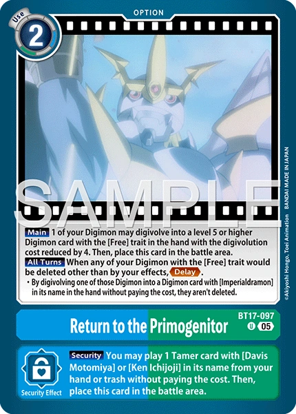 Return to the Primogenitor BT17-097 U [Main] 1 of your Digimon may digivolve into a level 5 or higher Digimon card with the [Free] trait in your hand with the digivolution cost reduced by 4. Then, place this card in the battle area. [All Turns] When one of your Digimon with the [Free] trait would be deleted other than by one of your effects, <Delay> • By digivolving that Digimon into a Digimon card with [Imperialdramon] in its name in the hand without paying the cost, prevent that deletion. --- [Security] You may play 1 Tamer card with [Davis Motomiya] or [Ken Ichijoji] in its name from your hand or trash without paying the cost. Then, place this card in the battle area.