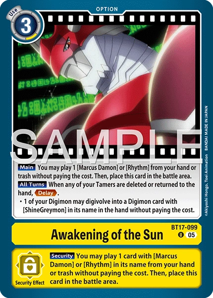 Awakening of the Sun BT17-099 U [Main] You may play 1 [Marcus Damon] or [Rhythm] from your hand or trash without paying the cost. Then, place this card in the battle area. [All Turns] When one of your Tamers is deleted or returned to the hand, <Delay> • 1 of your Digimon may digivolve into a Digimon card with [ShineGreymon] in its name in the hand without paying the cost. --- [Security] You may play 1 card with [Marcus Damon] or [Rhythm] in its name from your hand or trash without paying the cost. Then, place this card in the battle area.