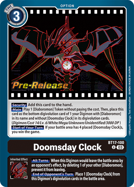Doomsday Clock BT17-100 U [Security] Add this card to the hand. [Main] Play 1 [Diaboromon] Token without paying the cost. Then, place this card as the bottom digivolution card of 1 your Digimon with [Diaboromon] in its name and without [Doomsday Clock] in its digivolution cards. (Digimon/Cost 14/Lv. 6/White/Mega/Unknown/Unidentified/3000 DP) [Start of Your Turn] If your battle area has 4 placed [Doomsday Clock]s, you win the game. --- [All Turns] When this Digimon would leave the battle area by an opponent's effect, by deleting 1 of your other [Diaboromon], prevent it from leaving. [End of Opponent's Turn] Place 1 [Doomsday Clock] from this Digimon's digivolution cards in the battle area.