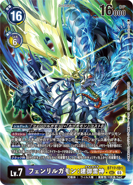 Lv.7 フェンリルガモン:建御雷神 BT17-101 SEC 究極体 | ウィルス種 | 魔獣型/X抗体/SoC [トラッシュ]【自分のターン】「パルスモン」の記述があるLv.6の自分のデジモンが登場したとき、自分のデジモン2体でこのカードにジョグレス進化できる。 【進化時】ターン終了まで、相手のデジモン1体をDP-16000。ジョグレス進化していたなら、メモリーを相手側の3にできる。その後、このデジモンの進化元にテイマーカードがあるなら、メモリー+1し、≪リカバリー+1《デッキ》≫。 【アタック時】自分のセキュリティを上から1枚破棄することで、相手のセキュリティを上から1枚破棄する。 ---