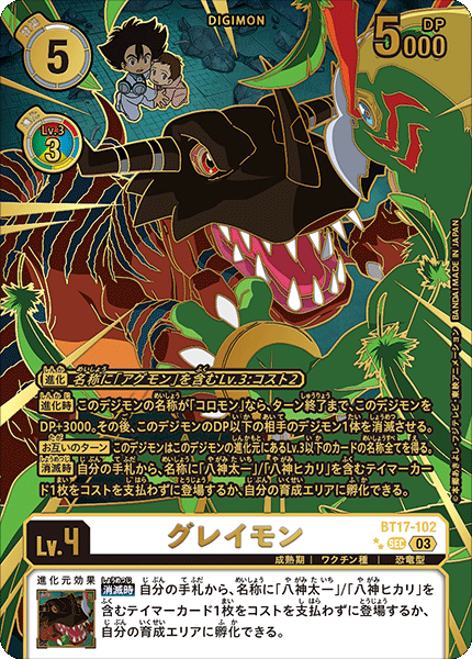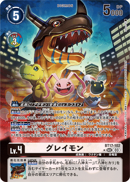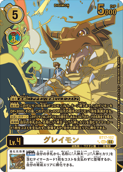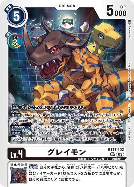 Lv.4 グレイモン BT17-102 SEC 成熟期 | ワクチン種 | 恐竜型 【進化時】このデジモンの名称が「コロモン」なら、ターン終了まで、このデジモンをDP+3000。その後、このデジモンのDP以下の相手のデジモン1体を消滅させる。 【お互いのターン】このデジモンはこのデジモンの進化元にあるLv.3以下のカードの名称全てを得る。 【消滅時】自分の手札から、名称に「八神太一」/「八神ヒカリ」を含むテイマーカード1枚をコストを支払わずに登場するか、自分の育成エリアに孵化できる。 --- 【消滅時】自分の手札から、名称に「八神太一」/「八神ヒカリ」を含むテイマーカード1枚をコストを支払わずに登場するか、自分の育成エリアに孵化できる。