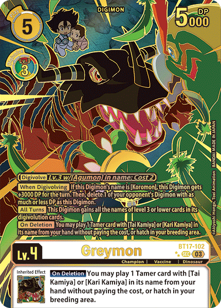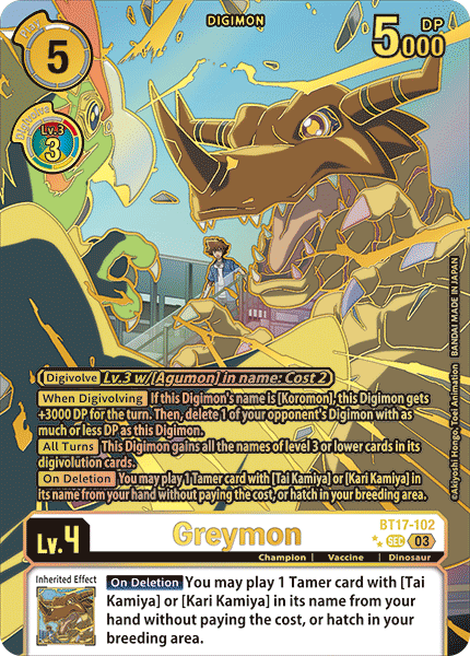 Lv.4 Greymon BT17-102 SEC Champion | Vaccine | Dinosaur [Digivolve] Lv.3 w/[Agumon] in name: Cost 2 [When Digivolving] If this Digimon's name is [Koromon], this Digimon gets +3000 DP for the turn. Then, delete 1 of your opponent's Digimon with as much or less DP as this Digimon. [All Turns] This Digimon gains all the names of level 3 or lower cards in its digivolution cards. [On Deletion] You may play 1 Tamer card with [Tai Kamiya] or [Kari Kamiya] in its name from your hand without paying the cost, or hatch in your breeding area. --- [On Deletion] You may play 1 Tamer card with [Tai Kamiya] or [Kari Kamiya] in its name from your hand without paying the cost, or hatch in your breeding area.