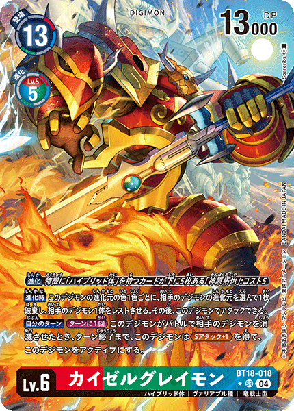 Lv.6 カイゼルグレイモン BT18-018 SR ハイブリッド体 | ヴァリアブル種 | 竜戦士型 【進化時】このデジモンの進化元の色1色ごとに、相手のデジモンの進化元を選んで1枚破棄し、相手のデジモン1体をレストさせる。その後、このデジモンでアタックできる。 【自分のターン】[ターンに1回]このデジモンがバトルで相手のデジモンを消滅させたとき、ターン終了まで、このデジモンは≪Sアタック+1≫を得て、このデジモンをアクティブにする。 ---