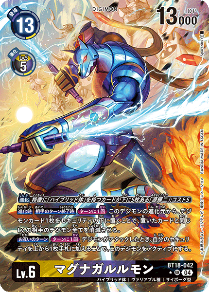 Lv.6 MagnaGarurumon BT18-042 SR Hybrid | Variable | Cyborg [Digivolve] [Koji Minamoto] w/5 [Hybrid] trait cards under: Cost 5 [When Digivolving] [End of Opponent's Turn] [Once Per Turn] By placing 1 Digimon card from this Digimon's digivolution cards as your bottom security card, delete all of your opponent's Digimon with the same level as the placed card. [All Turns] [Once Per Turn] When a Digimon attacks, by adding the top card of your security stack to the hand, unsuspend this Digimon.