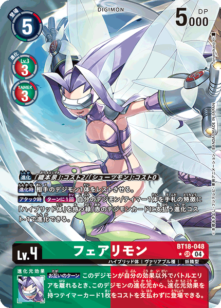 Lv.4 フェアリモン BT18-048 SR ハイブリッド体 | ヴァリアブル種 | 妖精型 【進化時】相手のデジモン1体をレストさせる。 【アタック時】[ターンに1回]自分のデジモン/テイマー1体を手札の特徴に「ハイブリッド体」を持つ緑/赤のデジモンカードに支払う進化コスト-1で進化できる。 --- 【お互いのターン】このデジモンが自分の効果以外でバトルエリアを離れるとき、このデジモンの進化元から、進化元効果を持つテイマーカード1枚をコストを支払わずに登場できる。
