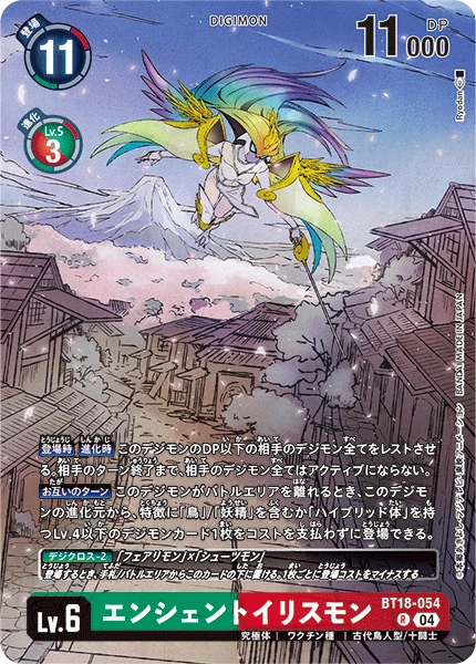 Lv.6 エンシェントイリスモン BT18-054 R 究極体 | ワクチン種 | 古代鳥人型/十闘士 【登場時】【進化時】このデジモンのDP以下の相手のデジモン全てをレストさせる。相手のターン終了まで、相手のデジモン全てはアクティブにならない。 【お互いのターン】このデジモンがバトルエリアを離れるとき、このデジモンの進化元から、特徴に「鳥」/「妖精」を含むか「ハイブリッド体」を持つLv.4以下のデジモンカード1枚をコストを支払わずに登場できる。 ---