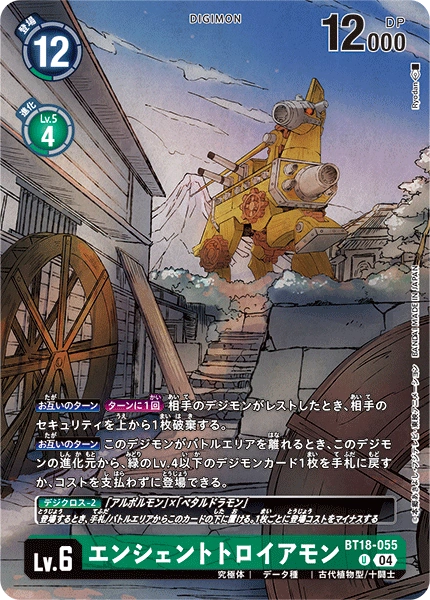 Lv.6 エンシェントトロイアモン BT18-055 U 究極体 | データ種 | 古代植物型/十闘士 【お互いのターン】[ターンに1回]相手のデジモンがレストしたとき、相手のセキュリティを上から1枚破棄する。 【お互いのターン】このデジモンがバトルエリアを離れるとき、このデジモンの進化元から、緑のLv.4以下のデジモンカード1枚を手札に戻すか、コストを支払わずに登場できる。 ---