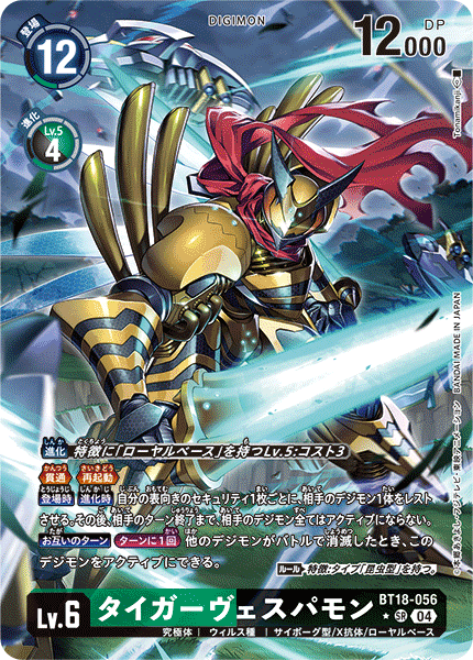 Lv.6 タイガーヴェスパモン BT18-056 SR 究極体 | ウィルス種 | サイボーグ型/X抗体/ローヤルベース ≪貫通≫≪再起動≫ 【登場時】【進化時】自分の表向きのセキュリティ1枚ごとに、相手のデジモン1体をレストさせる。その後、相手のターン終了まで、相手のデジモン全てはアクティブにならない。 【お互いのターン】[ターンに1回]他のデジモンがバトルで消滅したとき、このデジモンをアクティブにできる。 〈ルール〉特徴:タイプ「昆虫型」を持つ。 ---