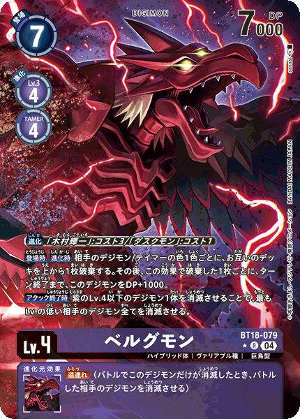 Lv.4 ベルグモン BT18-079 R ハイブリッド体 | ヴァリアブル種 | 巨鳥型 【登場時】【進化時】相手のデジモン/テイマーの色1色ごとに、お互いのデッキを上から1枚破棄する。その後、この効果で破棄した1枚ごとに、ターン終了まで、このデジモンをDP+1000。 【アタック終了時】紫のLv.4以下のデジモン1体を消滅させることで、最もLv.の低い相手のデジモン全てを消滅させる。 --- ≪道連れ≫(バトルでこのデジモンだけが消滅したとき、バトルした相手のデジモンを消滅させる)