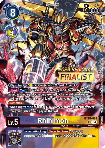 Lv.5 Rhihimon BT18-081 U Hybrid | Variable | Warrior [Hand] [Main] By placing 1 [Loweemon] and 1 [KaiserLeomon] from your trash under 1 of your purple or yellow Tamers, digivolve it into this card for a digivolution cost of 3, ignoring digivolution requirements. <Jamming> (This Digimon can't be deleted in battles against Security Digimon.) [When Digivolving] You may play 1 Tamer card with inherited effects from your trash without paying the cost. --- [When Attacking] [Once Per Turn] 1 of your opponent's Digimon gets -4000 DP for the turn.