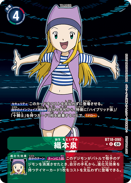 織本泉 BT18-090 R 【セキュリティ】このカードをコストを支払わずに登場させる。 【自分のメインフェイズ開始時】自分の手札から、特徴に「ハイブリッド体」/「十闘士」を持つカード1枚を破棄することで、≪1ドロー≫。 --- 【自分のターン】[ターンに1回]このデジモンがバトルで相手のデジモンを消滅させたとき、自分の手札から、進化元効果を持つテイマーカード1枚をコストを支払わずに登場できる。