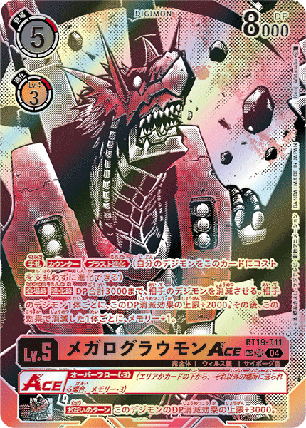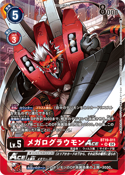 Lv.5 メガログラウモンACE BT19-011 SR 完全体 | ウィルス種 | サイボーグ型 [手札]【カウンター】≪ブラスト進化≫(自分のデジモンをこのカードにコストを支払わずに進化できる) 【登場時】【進化時】DP合計3000まで、相手のデジモンを消滅させる。相手のデジモン1体ごとに、このDP消滅効果の上限+2000。その後、この効果で消滅した1体ごとに、メモリー+1。 --- 【お互いのターン】このデジモンのDP消滅効果の上限+3000。