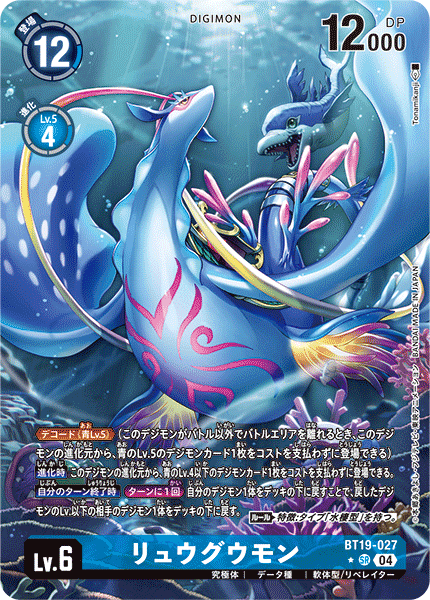 Lv.6 リュウグウモン BT19-027 SR 究極体 | データ種 | 軟体型/リベレイター ≪デコード《青Lv.5》≫(このデジモンがバトル以外でバトルエリアを離れるとき、このデジモンの進化元から、青のLv.5のデジモンカード1枚をコストを支払わずに登場できる) 【進化時】このデジモンの進化元から、青のLv.4以下のデジモンカード1枚をコストを支払わずに登場できる。 【自分のターン終了時】[ターンに1回]自分のデジモン1体をデッキの下に戻すことで、戻したデジモンのLv.以下の相手のデジモン1体をデッキの下に戻す。 〈ルール〉特徴:タイプ「水棲型」を持つ。 ---