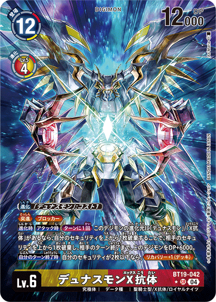 Lv.6 デュナスモンX抗体 BT19-042 SR 究極体 | データ種 | 聖騎士型/X抗体/ロイヤルナイツ ≪突進≫≪ブロッカー≫ 【進化時】【アタック時】[ターンに1回]このデジモンの進化元に「デュナスモン」/「X抗体」があるなら、自分のセキュリティを上から1枚破棄することで、相手のセキュリティを上から1枚破棄し、相手のターン終了まで、このデジモンをDP+6000。 【自分のターン終了時】自分のセキュリティが2枚以下なら、≪リカバリー+1《デッキ》≫。 ---