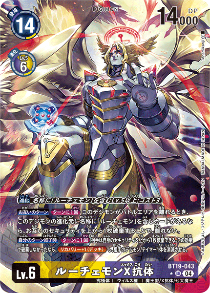 Lv.6 ルーチェモンX抗体 BT19-043 SR 究極体 | ウィルス種 | 魔王型/X抗体/七大魔王 【お互いのターン】[ターンに1回]このデジモンがバトルエリアを離れるとき、このデジモンの進化元に名称に「ルーチェモン」を含むカードがあるなら、お互いのセキュリティを上から1枚破棄することで、離れない。 【自分のターン終了時】[ターンに1回]相手は自身のセキュリティを上から1枚破棄できる。この効果で破棄しなかったなら、≪リカバリー+1《デッキ》≫し、相手のデジモン/テイマー1体を消滅させる。 ---