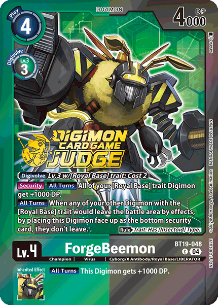 Lv.4 ForgeBeemon BT19-048 C champion | Virus | Cyborg/X Antibody/Royal Base/LIBERATOR [Digivolve] Lv.3 w/[Royal Base] trait: Cost 2 (Security) [All Turns] All of your [Royal Base] trait Digimon get +1000 DP. [All Turns] [Once Per Turn] When any of your other Digimon with the [Royal Base] trait would leave the battle area by effects, by placing this Digimon as the face-up bottom security card, they don't leave. (Rule) Trait: Has [Insectoid] Type. --- [All Turns] This Digimon gets +1000 DP.