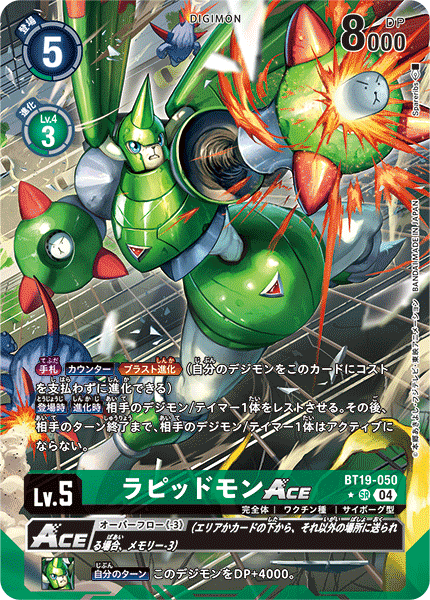 Lv.5 Rapidmon ACE BT19-050 SR ultimate | Vaccine | Cyborg [Hand] [Counter] <Blast Digivolve> (One of your Digimon may digivolve into this card without paying the cost.) [On Play] [When Digivolving] Suspend 1 of your opponent's Digimon or Tamers. Then, 1 of their Digimon or Tamers can't unsuspend until the end of their turn. --- <Overflow (-3)> (As this card moves from the battle area or under a card to another area, lose 3 memory.) [Your Turn] This Digimon gets +4000 DP.