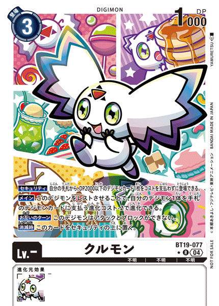 Lv.- クルモン BT19-077 R 不明 | 不明 | 不明 【セキュリティ】自分の手札から、DP2000以下のデジモンカード1枚をコストを支払わずに登場できる。 【メイン】このデジモンをレストさせることで、自分のデジモン1体を手札のデジモンカードに支払う進化コスト-2で進化できる。 【お互いのターン】このデジモンはアタックとブロックができない。 【消滅時】このカードをセキュリティの上に置く。 ---