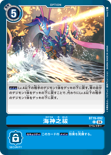 海神之祓 BT19-092 C リベレイター 【メイン】Lv.4以下の相手のデジモン1体をデッキの下に戻す。青の自分のデジモン1体をデッキの下に戻すことで、代わりにLv.6以下の相手のデジモン1体をデッキの下に戻す。 --- 【セキュリティ】このカードの【メイン】効果を発揮する。