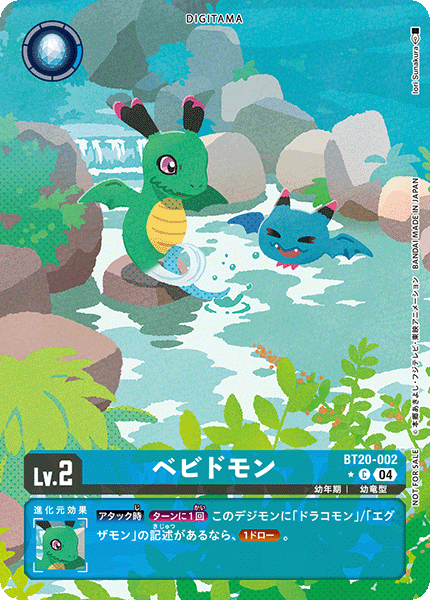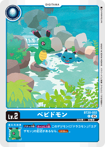 Lv.2 ベビドモン BT20-002 C 幼年期 | 幼竜型 --- 【アタック時】[ターンに1回]このデジモンに「ドラコモン」/「エグザモン」の記述があるなら、≪1ドロー≫。