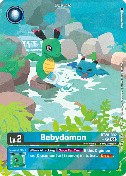 Lv.2 Bebydomon BT20-002 C In-Training | Baby Dragon --- [When Attacking] [Once Per Turn] If this Digimon has [Dracomon] or [Examon] in its text, <Draw 1>.