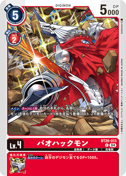 Lv.4 バオハックモン BT20-013 C 成熟期 | データ種 | 恐竜型 【メイン】[ターンに1回]自分の手札から、名称に「シスタモン」/「ガンクゥモン」を含むデジモンカード1枚を支払う登場コスト-2で登場できる。 --- 【自分のターン】自分のデジモン全てをDP+1000。