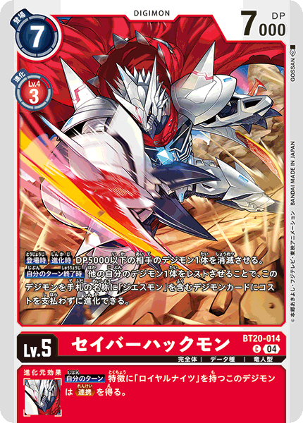 Lv.5 セイバーハックモン BT20-014 C 完全体 | データ種 | 竜人型 【登場時】【進化時】DP5000以下の相手のデジモン1体を消滅させる。 【自分のターン終了時】他の自分のデジモン1体をレストさせることで、このデジモンを手札の名称に「ジエスモン」を含むデジモンカードにコストを支払わずに進化できる。 --- 【自分のターン】特徴に「ロイヤルナイツ」を持つこのデジモンは≪連携≫を得る。