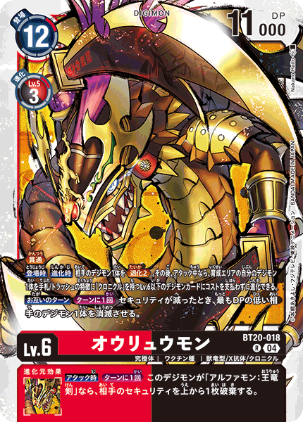 Lv.6 オウリュウモン BT20-018 R 究極体 | ワクチン種 | 獣竜型/X抗体/クロニクル ≪貫通≫ 【登場時】【進化時】相手のデジモン1体を≪退化2≫。その後、アタック中なら、育成エリアの自分のデジモン1体を手札/トラッシュの特徴に「クロニクル」を持つLv.6以下のデジモンカードにコストを支払わずに進化できる。 【お互いのターン】[ターンに1回]セキュリティが減ったとき、最もDPの低い相手のデジモン1体を消滅させる。 --- 【アタック時】[ターンに1回]このデジモンが「アルファモン:王竜剣」なら、相手のセキュリティを上から1枚破棄する。