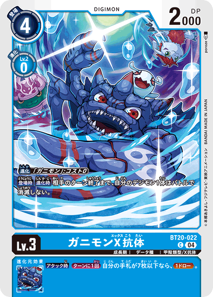 Lv.3 ガニモンX抗体 BT20-022 C 成長期 | データ種 | 甲殻類型/X抗体 【登場時】【進化時】相手のターン終了まで、自分のデジモン1体はバトルで消滅しない。 --- 【アタック時】[ターンに1回]自分の手札が7枚以下なら、≪1ドロー≫。