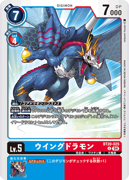 Lv.5 ウイングドラモン BT20-025 U 完全体 | ワクチン種 | 天竜型 【登場時】【進化時】DP6000以下の相手のデジモン1体を消滅させる。 【お互いのターン】このデジモンは「エグザモン」のジョグレス進化で、「スレイヤードラモン」• Lv.6としても扱う。 --- ≪Sアタック+1≫(このデジモンがチェックする枚数+1)