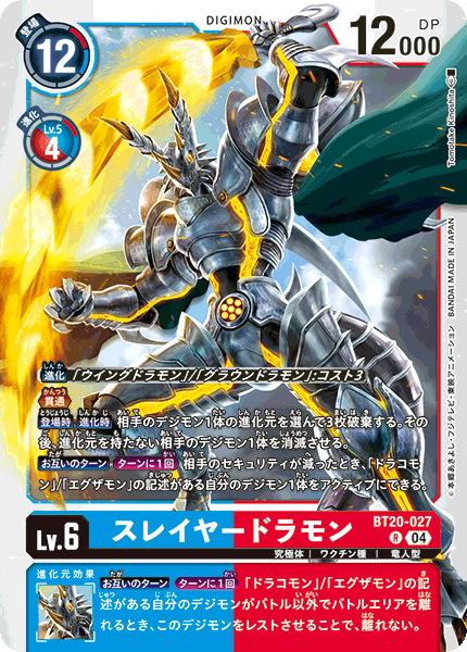 Lv.6 スレイヤードラモン BT20-027 R 究極体 | ワクチン種 | 竜人型 ≪貫通≫ 【登場時】【進化時】相手のデジモン1体の進化元を選んで3枚破棄する。その後、進化元を持たない相手のデジモン1体を消滅させる。 【お互いのターン】[ターンに1回]相手のセキュリティが減ったとき、「ドラコモン」/「エグザモン」の記述がある自分のデジモン1体をアクティブにできる。 --- 【お互いのターン】[ターンに1回]「ドラコモン」/「エグザモン」の記述がある自分のデジモンがバトル以外でバトルエリアを離れるとき、このデジモンをレストさせることで、離れない。