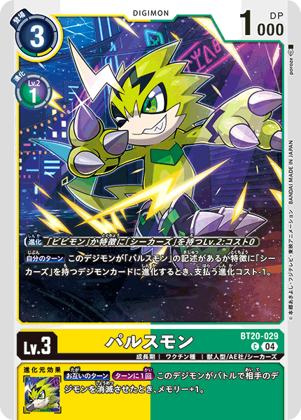 Lv.3 パルスモン BT20-029 C 成長期 | ワクチン種 | 獣人型/AE社/シーカーズ 【自分のターン】このデジモンが「パルスモン」の記述があるか特徴に「シーカーズ」を持つデジモンカードに進化するとき、支払う進化コスト-1。 --- 【お互いのターン】[ターンに1回]このデジモンがバトルで相手のデジモンを消滅させたとき、メモリー+1。