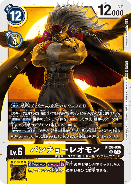 Lv.6 バンチョーレオモン BT20-036 U 究極体 | ワクチン種 | 獣人型/バンチョー/アクセル このカードが登場するとき、特徴に「アクセル」を持つ自分のデジモンがいるなら、支払う登場コスト-5。 【登場時】【進化時】相手のデジモン1体を≪退化2≫。その後、相手のターン終了まで、相手のデジモン1体をDP-5000。 【自分のターン終了時】このデジモンと他の自分のデジモンで、手札の名称に「カオスモン」を含むデジモンカードにジョグレス進化できる。その後、ジョグレス進化したデジモンでアタックできる。 --- 【相手のターン】[ターンに1回]相手のデジモンがアタックしたとき、アタックの対象をこのデジモンに変更できる。