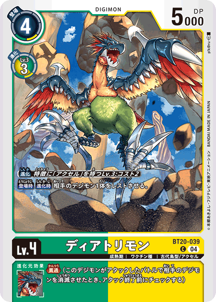 Lv.4 ディアトリモン BT20-039 C 成熟期 | ワクチン種 | 古代鳥型/アクセル 【登場時】【進化時】相手のデジモン1体をレストさせる。 --- ≪貫通≫(このデジモンがアタックしたバトルで相手のデジモンを消滅させたとき、アタック終了前にチェックする)