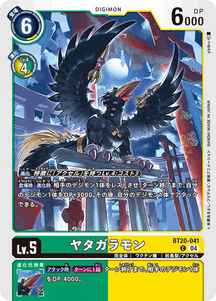 Lv.5 ヤタガラモン BT20-041 C 完全体 | ワクチン種 | 妖鳥型/アクセル 【登場時】【進化時】相手のデジモン1体をレストさせ、ターン終了まで、自分のデジモン1体をDP+3000。その後、自分のデジモン1体でアタックできる。 --- 【アタック時】[ターンに1回]ターン終了まで、相手のデジモン1体をDP-4000。
