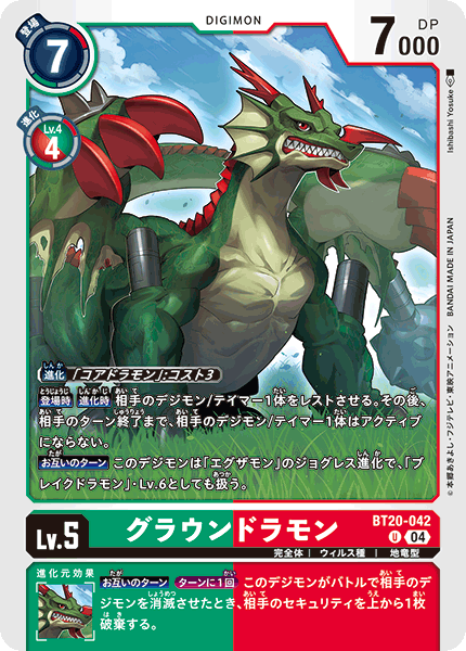 Lv.5 グラウンドラモン BT20-042 U 完全体 | ウィルス種 | 地竜型 【登場時】【進化時】相手のデジモン/テイマー1体をレストさせる。その後、相手のターン終了まで、相手のデジモン/テイマー1体はアクティブにならない。 【お互いのターン】このデジモンは「エグザモン」のジョグレス進化で、「ブレイクドラモン」• Lv.6としても扱う。 --- 【お互いのターン】[ターンに1回]このデジモンがバトルで相手のデジモンを消滅させたとき、相手のセキュリティを上から1枚破棄する。