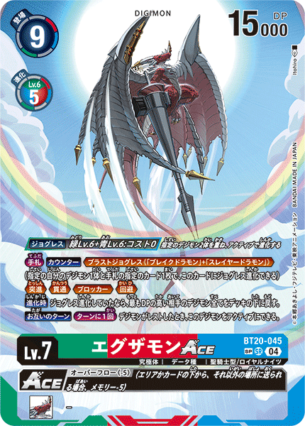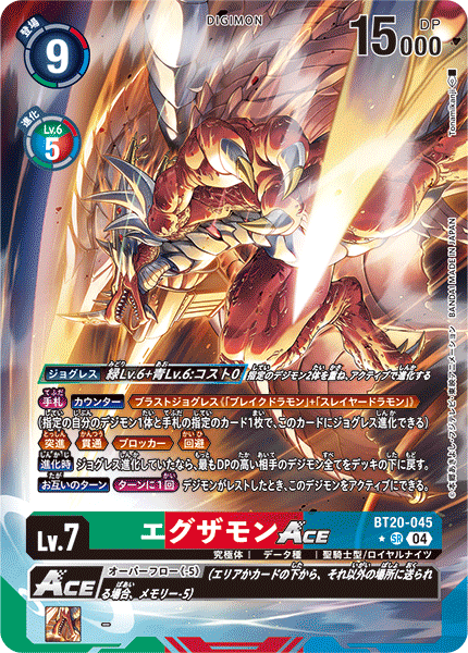 Lv.7 エグザモンACE BT20-045 SR 究極体 | データ種 | 聖騎士型/ロイヤルナイツ [手札]【カウンター】≪ブラストジョグレス《「ブレイクドラモン」+「スレイヤードラモン」》≫(指定の自分のデジモン1体と手札の指定のカード1枚で、このカードにジョグレス進化できる) ≪突進≫≪貫通≫≪ブロッカー≫≪回避≫ 【進化時】ジョグレス進化していたなら、最もDPの高い相手のデジモン全てをデッキの下に戻す。 【お互いのターン】[ターンに1回]デジモンがレストしたとき、このデジモンをアクティブにできる。 ---