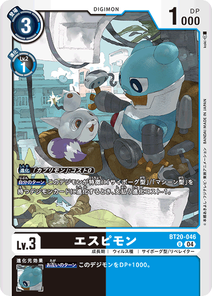 Lv.3 エスピモン BT20-046 U 成長期 | ウィルス種 | サイボーグ型/リベレイター 【自分のターン】このデジモンが特徴に「サイボーグ型」/「マシーン型」を持つデジモンカードに進化するとき、支払う進化コスト-1。 --- 【お互いのターン】このデジモンをDP+1000。
