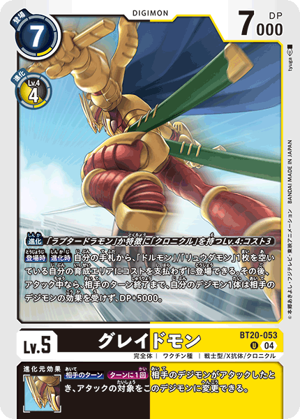 Lv.5 グレイドモン BT20-053 U 完全体 | ワクチン種 | 戦士型/X抗体/クロニクル 【登場時】【進化時】自分の手札から、「ドルモン」/「リュウダモン」1枚を空いている自分の育成エリアにコストを支払わずに登場できる。その後、アタック中なら、相手のターン終了まで、自分のデジモン1体は相手のデジモンの効果を受けず、DP+5000。 --- 【相手のターン】[ターンに1回]相手のデジモンがアタックしたとき、アタックの対象をこのデジモンに変更できる。