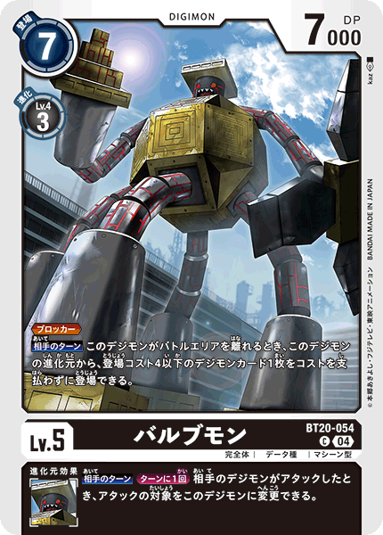 Lv.5 バルブモン BT20-054 C 完全体 | データ種 | マシーン型 ≪ブロッカー≫ 【相手のターン】このデジモンがバトルエリアを離れるとき、このデジモンの進化元から、登場コスト4以下のデジモンカード1枚をコストを支払わずに登場できる。 --- 【相手のターン】[ターンに1回]相手のデジモンがアタックしたとき、アタックの対象をこのデジモンに変更できる。