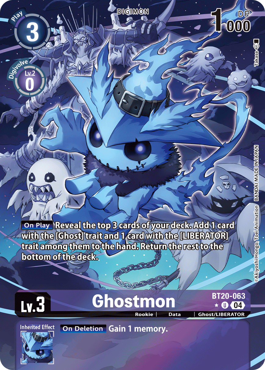 Lv.3 Ghostmon BT20-063 C rookie | Data | Ghost/LIBERATOR [On Play] Reveal the top 3 cards of your deck. Add 1 card with the [Ghost] trait and 1 card with the [LIBERATOR] trait among them to the hand. Return the rest to the bottom of the deck. --- [On Deletion] Gain 1 memory.