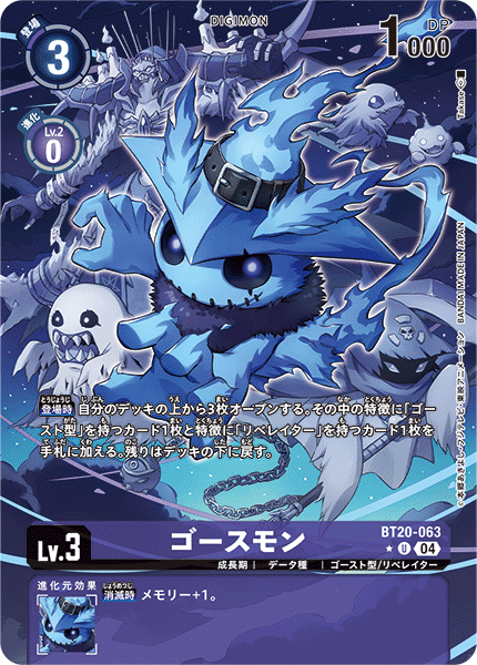 Lv.3 ゴースモン BT20-063 U 成長期 | データ種 | ゴースト型/リベレイター 【登場時】自分のデッキの上から3枚オープンする。その中の特徴に「ゴースト型」を持つカード1枚と特徴に「リベレイター」を持つカード1枚を手札に加える。残りはデッキの下に戻す。 --- 【消滅時】メモリー+1。
