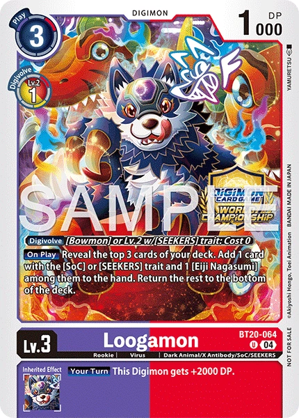 Lv.3 Loogamon BT20-064 U Rookie | Virus | Dark Animal/X Antibody/SoC/SEEKERS [Digivolve] [Bowmon] or Lv.2 w/[SEEKERS] trait: Cost 0 [On Play] Reveal the top 3 cards of your deck. Add 1 card with the [SoC] or [SEEKERS] trait and 1 [Eiji Nagasumi] among them to the hand. Return the rest to the bottom of the deck. --- [Your Turn] This Digimon gets +2000 DP.